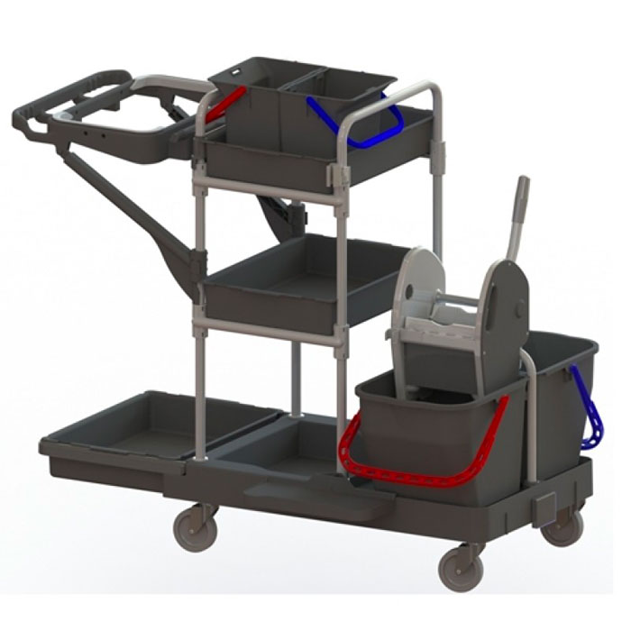 Base reggiscopa Base in polipropilene con 4 ruote in metallo Ø 100 mm Supporto sacco da 120 l in polipropilene (completo di blocca sacco e supporti di rinforzo laterali) Portamanico Supporto in fibra di vetro per accessori con giunto a coda di rondine 2 supporti in Rilsan con fori frontali 3 vaschette in polipropilene Vaschetta in polipropilene da 35 l con griglia