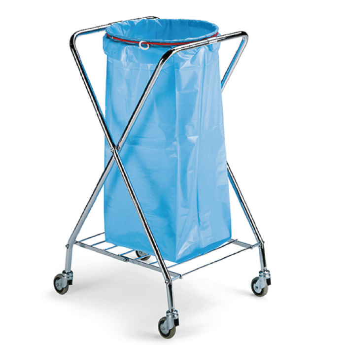 carrello portasacco a “x” in acciaio cromato con attacco quadro smontabile, ruote piroettanti da 80 mm e 3 clip fermasacco. portasacco smontabile che agevola l’operatore nello svuotamento del sacco. griglia reggisacco e telaio pieghevoli per un minor ingombro quando non utilizzato. ruote piroettanti che facilitano lo spostamento. dotato di due ganci utili per il trasporto attrezzatura varia. capacità 120 litri. dimensioni cm 62x60x103.