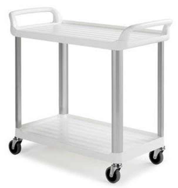 Carrello di servizio a 2 ripiani , con montanti in plastica, 2 impugnature con ruote da 100 x 28 mm. portata 50 kg. per piano. Ideale per il trasporto di oggetti vari nel settore della ristorazione e della sanità. – Dimensioni L=50 cm P=111 cm H=102 cm. Disponibile anche nella versione a 3 ripiani.