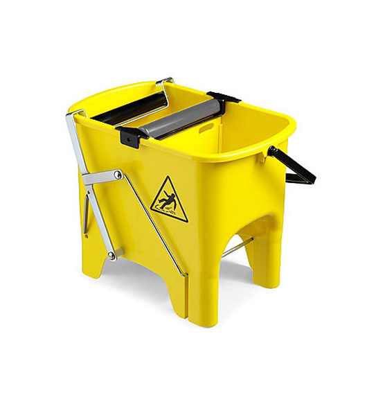 Secchio FILMOP monovasca da 15 litri con separatore e rullo strizzatore in gomma azionabile con il piede dall’operatore. In polipropilene copolimero, materiale di prima qualità: resistente agli urti, all’uso frequente e alle basse temperature, leggero, atossico e totalmente riciclabile. Serigrafia su entrambi i lati del secchio con disegno indicante “attenzione pavimento bagnato” Divisorio che mantiene separata l’acqua di risciacquo dal detergente.