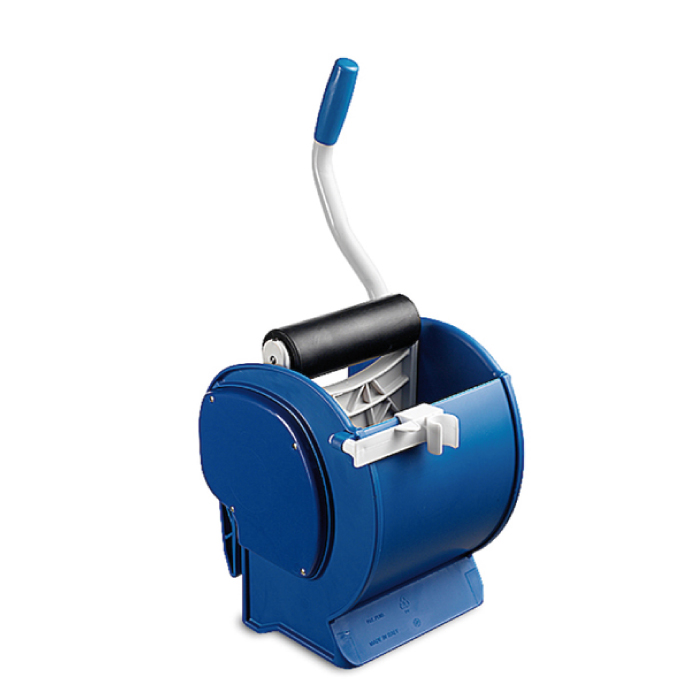 punto strizzatore in plastica con rullo grigio scuro, ø 53 mm colore blu. progettato senza il fondo per consentire l’operazione di risciacquo direttamente dall’interno dello strizzatore stesso. il manico in ferro verniciato è dotato di molla di ritorno che ne facilita l’utilizzo. compatibile con il sistema di lavaggio speedy.