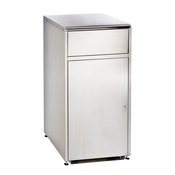 Contenitore svuota vassoi progettato per ospitare un cassonetto da 120 lt, venduto separatamente; sportello basculante per svuotamento vassoio; anta inferiore invertibile con chiusura a chiave triangolare; piedi regolabili in altezza (max 5 cm); ripiano superiore con guida ferma vassoi (disponibile in opzione); ideale per bar, fast-food, self-service e mense.
