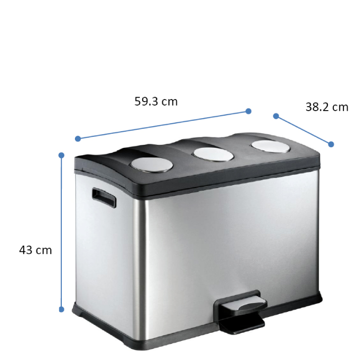 Pattumiera a pedale 12 litri x 3 secchi per la raccolta differenziata Acciaio inox satinato «anti traccia» .Secchi interni in polipropilene da 12 lt Capienza totale 36 lt. Sistema di apertura «soft close» Dimensioni: altezza cm 43, profondità cm 38.2, larghezza cm 59.3.
