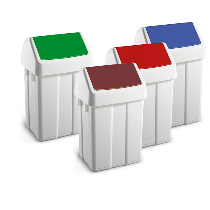 PATTY contenitore gettacarte certificato “Plastica Seconda Vita” (PSV) da lt 25 con coperchio basculante a colore indicato per la raccolta dei rifiuti in ambienti quali: alberghi, scuole, ospedali, ristorazione, mense e comunità in genere. Dimensioni: 30 x 25 x 52 cm