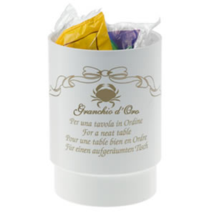 Portarifiuti da tavola in plastica. Dimensioni: diam. cm.11×14 h Articolo personalizzabile
