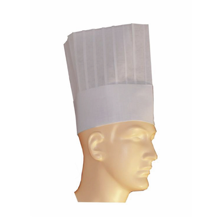 Cappello da cuoco alto 25 cm realizzato in carta crespata 80 gr/mq interamente piegato, fascia antisudore, regolabile, fresco e leggero. prezzo (1 cf da 10 pz)