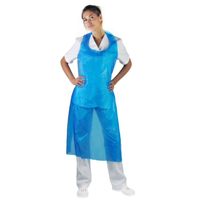 Grembiule a pettorina monouso in polietilene, cm 80×125 spessore 18 mcr. Busta da 100 pz. Cartone da 10 buste.