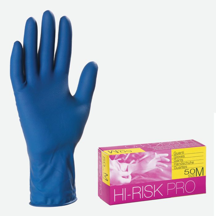 Guanto monouso in LATTICE DI GOMMA NATURALE di colore blue ad alta resistenza lunghezza 30 cm, spessore 0,25 ambidestri con polsino salvastrappo senza polvere lubrificante. Fnitura interna opaca ed esterna microruvida, di spessore e lunghezza maggiorata. Elevata sensibilità, destrezza e comfort. Ottima elasticità anche a basse temperature. Ottima resistenza chimica a detergenti e detersivi diluiti ed a soluzioni acquose in genere. Prezzo per box da 50 guanti..
