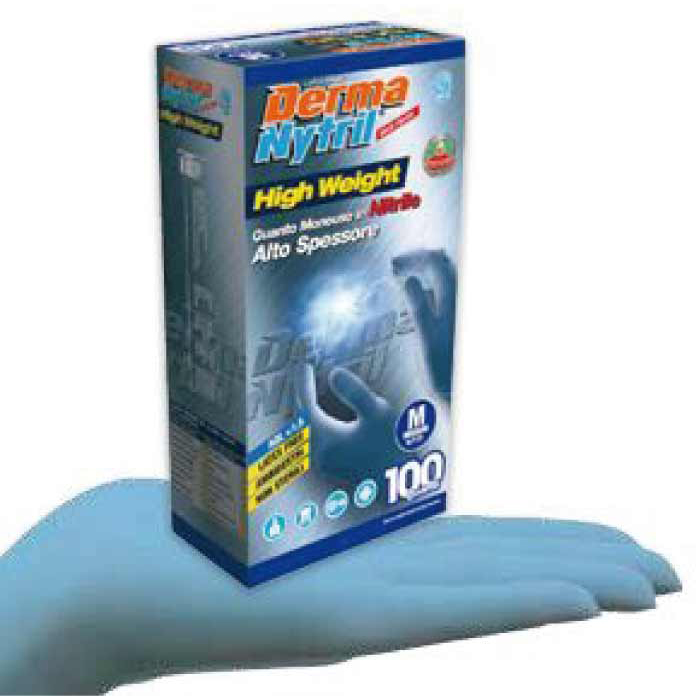 Guanto monouso ambidestro in nitrile, senza polvere, spessore maggiorato per un alto livello di protezione. Superficie esterna micro-testurizzata per garantire una presa più sicura. Privo di lattice di gomma naturale elimina il rischio di reazioni allergiche correlate alla presenza di proteine del lattice. Colore azzurro. Certificato III categoria. AQL 1. Spessori: 0,13 mm al palmo e 0,20 al dito. Peso di un guanto taglia M 6,80 gr. Prezzo per confezione/box da 100 guanti.