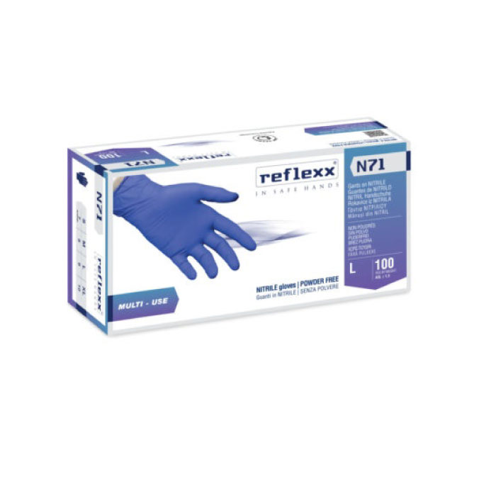 GUANTI IN NITRILE IPOALLERGENICI SENZA POLVERE, dedicati a soggetti con allergia al nitrile. Guanti Monouso, ambidestri. 100% Latex Free. Guanto Ipoallergenico, specifico alle esigenze di soggetti con allergia alle mani e dermatiti da contatto. Grazie alla tecnologia Low Derma (TM) Technology nasce il nuovo guanto per allergia al nitrile Reflexx N71 è un guanto idoneo all’utilizzo in diversi settori, in quanto, dato il suo spessore, è indicato per lavorazioni in ambito meccanico, industria leggera e anche per la manipolazione alimentare. L’assenza di polvere riduce il rischio di dermatiti e contaminazione DPI Cat. 3 di rischio anche per protezione da agenti chimici e microrganismi (Reg EU 2016/425).