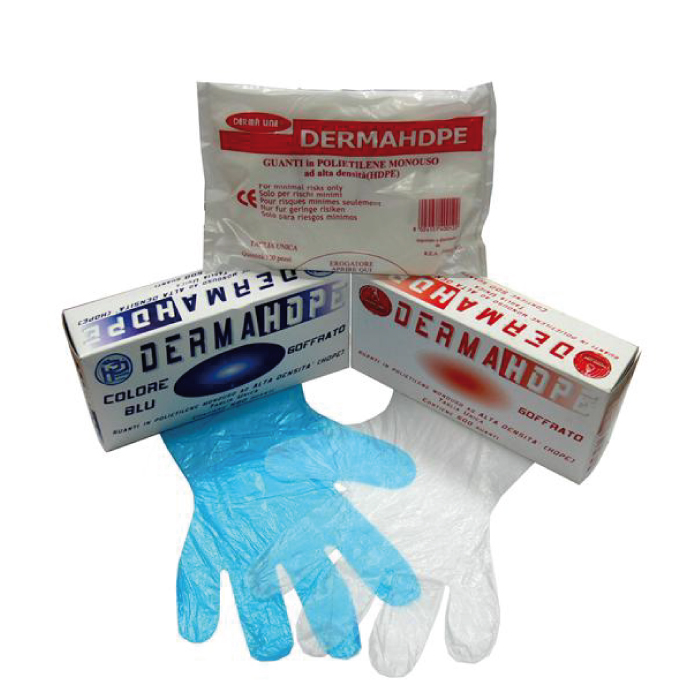 Guanto monouso extra fine SINTETICO IN HDPE (polietilene alta densità) ricavato da accoppiamento di due films fustellati e termo-sigillati sul contorno. Guanto usa e getta di utilizzo igenico per evitare contaminazioni mano/prodotto, con resistenza meccanica e chimica, idoneo ad uso solo temporaneo. Imballo da 100 confezioni da 100 pz. prezzo( 1 cf da 100 pz)