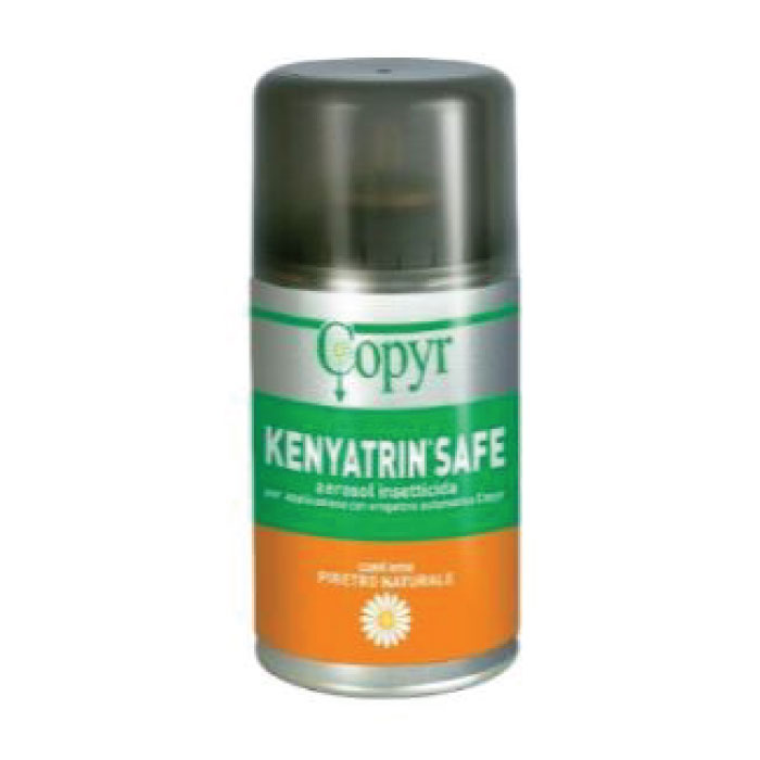 KENYATRIN SAFE insetticida spray per erogatore automatico contro mosche e zanzare a base di Piretro naturale 1% e Tetrametrina 1% sinergizzati con Piperonil Butossido 14%. Elevato effetto abbattente. La speciale valvola a dosaggio eroga una quantità prestabilita di prodotto, sufficiente ad assicurare il controllo di 200 mq di ambiente. Bombola da 250 ml. Imballo da 6 bombolette.