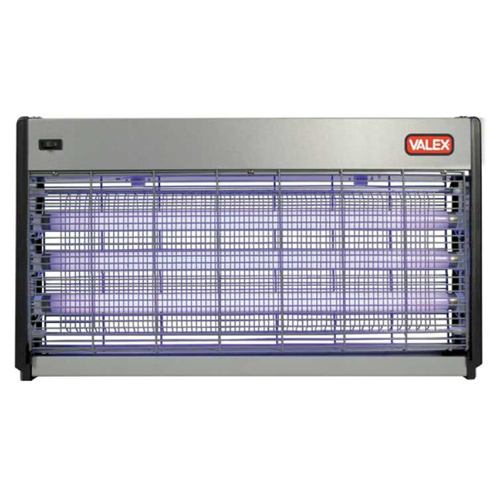 Lampada insetticida in acciaio inossidabile e materiale plastico ignifugo. Appendibile. Cassetto raccogli insetti. Completa di lampade attiniche (azzurre). Dimensioni 650x370x90 mm.