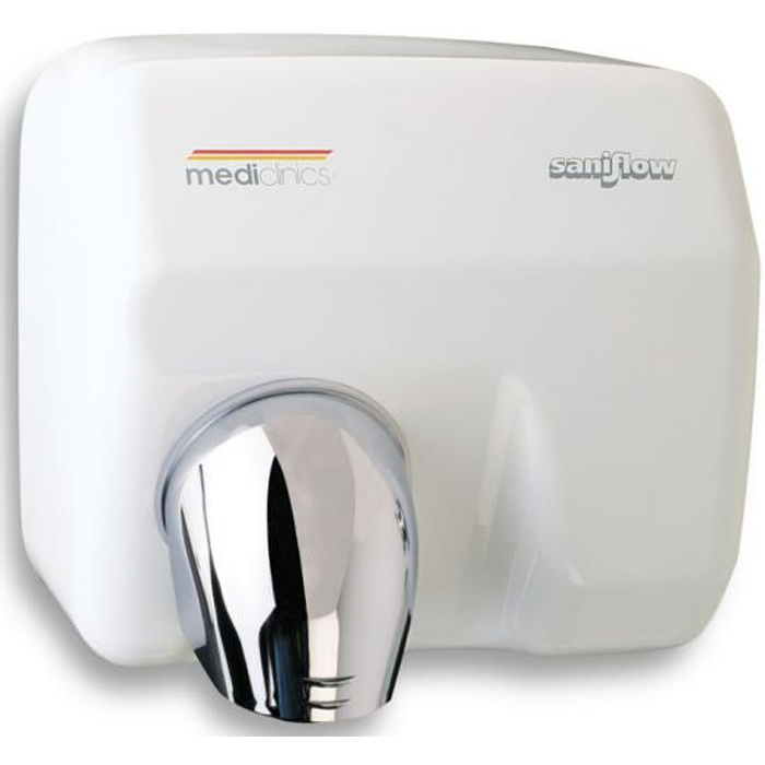 Asciugamani elettrici ad azionamento automatico SANIFLOW coperchio in acciaio mm 1,5 finitura con vernice epossidica bianca. Motore universale dotato di limitatore termico con cuscinetti a sfere sigillati ed autolubrificanti. Bocchetta girevole. Dimensioni mm 245x276x210 – Peso kg 4,65 – 2250 W – 5500 giri/minuto – Velocità aria 96 km/h.